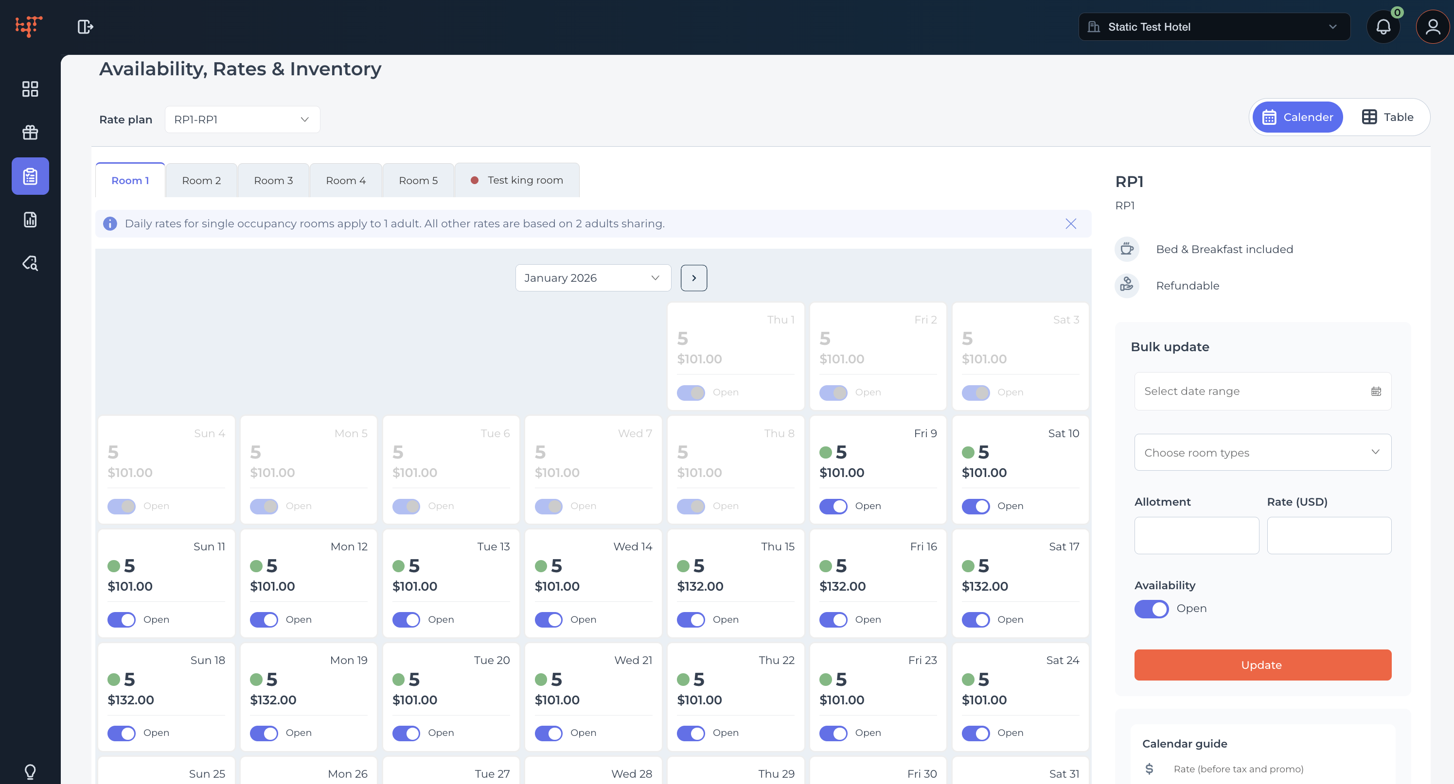 - Perform actions like toggling availability, updating allotment or rates, and viewing restrictions.